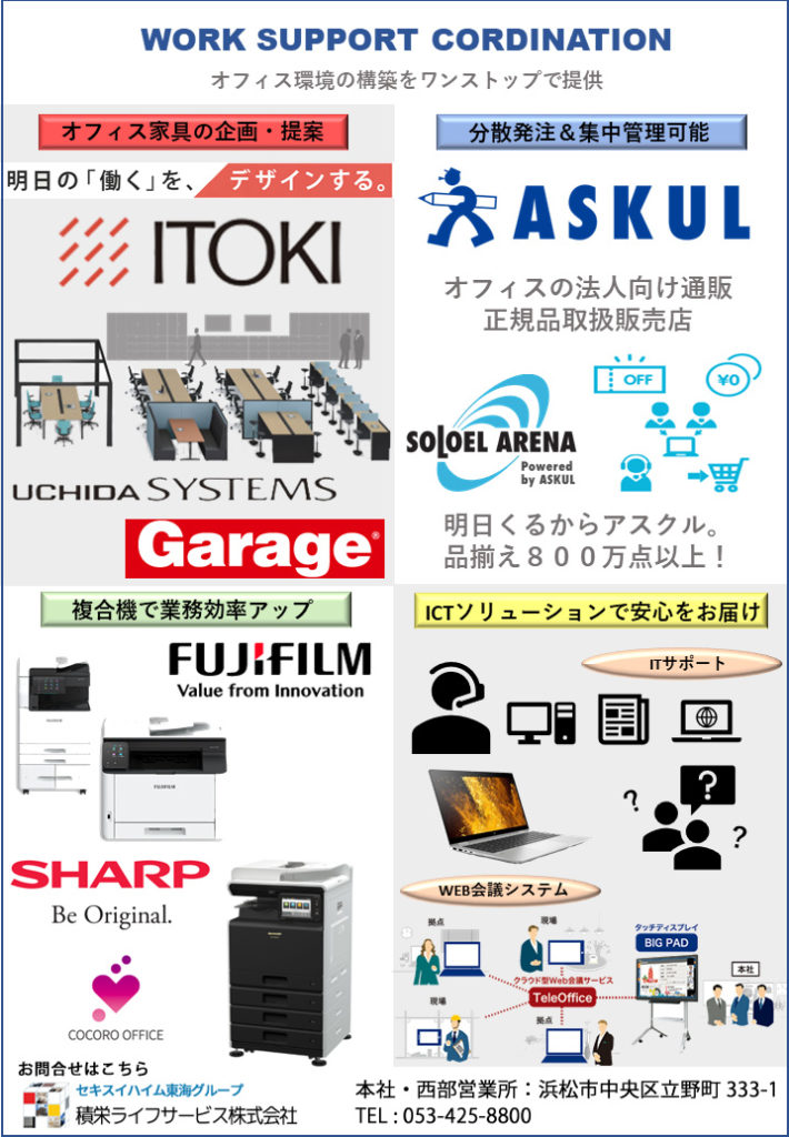 オフィスに欠かせない複合OA機器をはじめ、PC、オフィス家具、文房具や消耗品、セキュリティカメラ、高度医療機器など多彩な商材を扱うと同時に専門性の高いネットワーク工事も手掛けており、オフィス環境の構築をワンストップでリーズナブルな価格、サービスで請け負います。